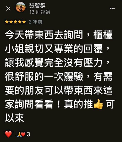 ➤ 張智群:「今天帶東西去詢問,櫃檯小姐親切又專業的回覆,讓我感覺完全沒有壓力,很舒服的一次體驗,有需要的朋友可以帶東西來這家詢問看看!真的很推👍可以來」