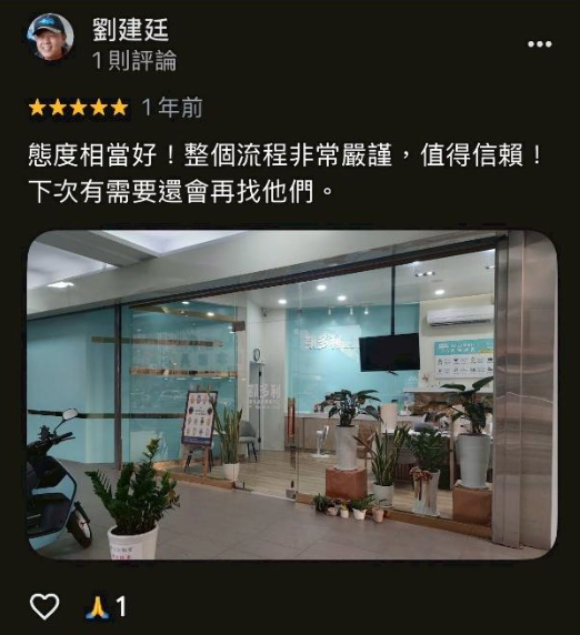 ➤ 劉建廷:「態度相當好!整個流程非常嚴謹,值得信賴!下次有需要還會再找他們。」